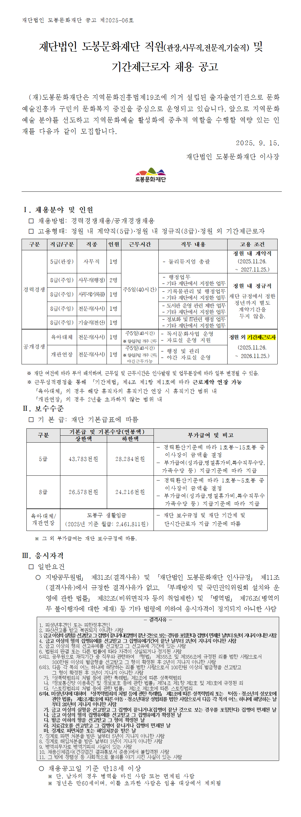 [채용] [제2025-06호] 도봉문화재단 직원 및 기간제근로자 채용 공고